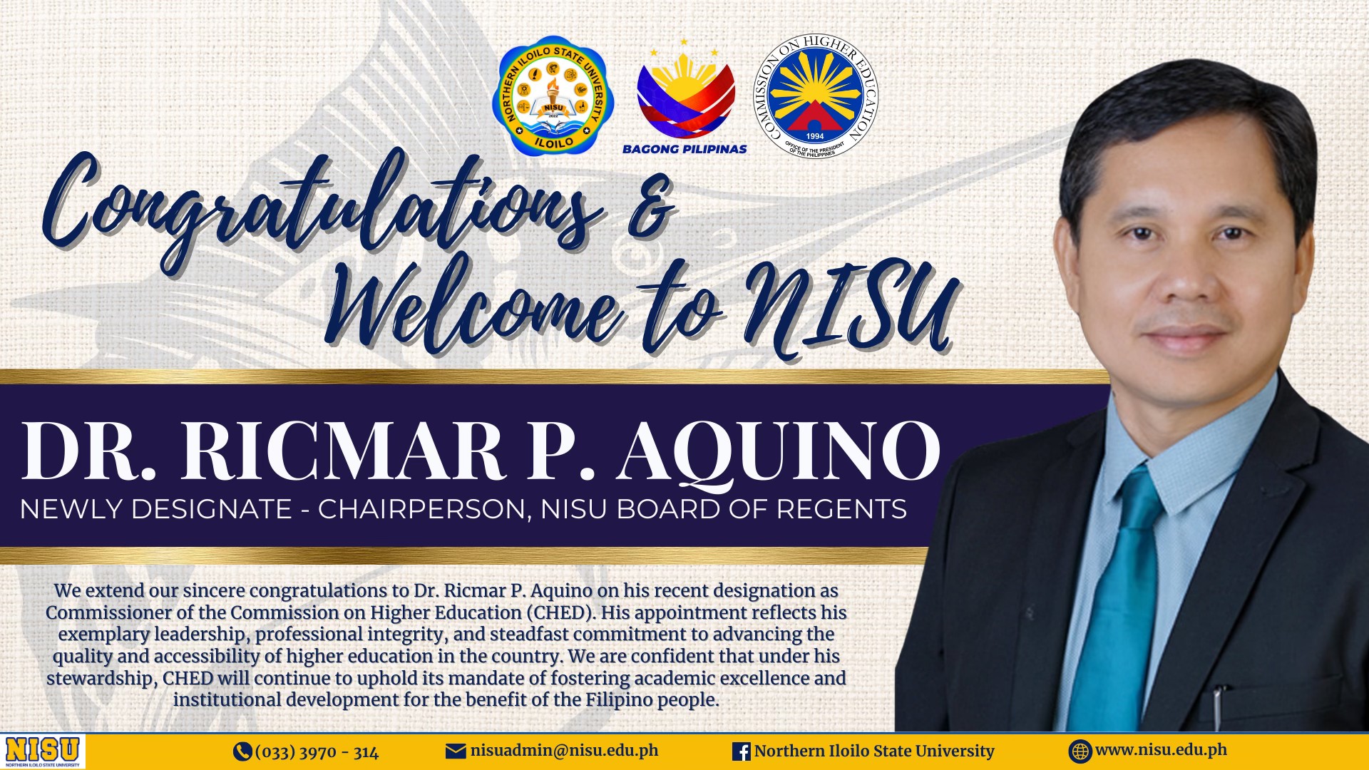 Dr. Ricmar P. Aquino Names as New Chairperson of the NISU Board of Regents
