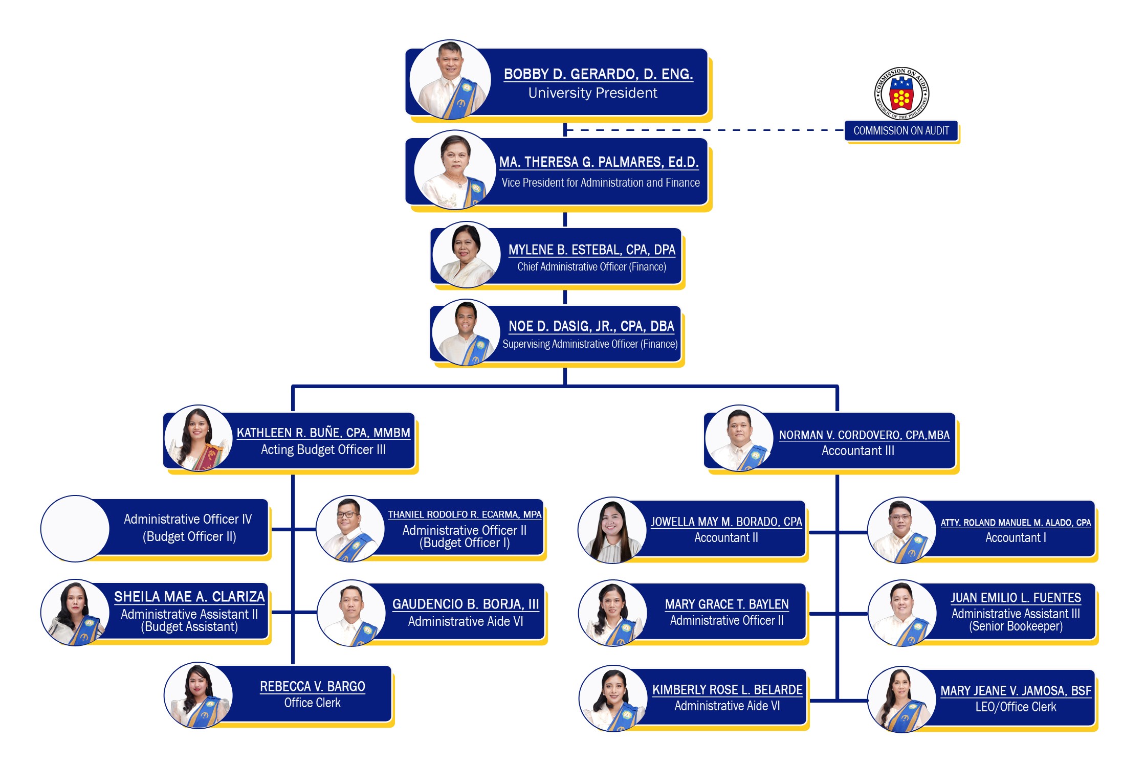 ![]() CORDOVERO, Norman V. Accountant III | ![]() DAIG, Ma. Lynnie L. Internal Auditor I | ![]() DASIG, Noe Jr. D. Supervising Administrative Officer (Finance) | DE ASIS, Jeshter P. Administrative Officer III | ![]() DEMALINAO, Jonalyn B. Administrative Aide VI | ![]() DORONILA, Leonor V. Administrative Aide VI | ![]() ECARMA, Thaniel Rodolfo R. Administrative Officer II | ![]() ESTEBAL, Honey Faye B. Internal Auditor III |