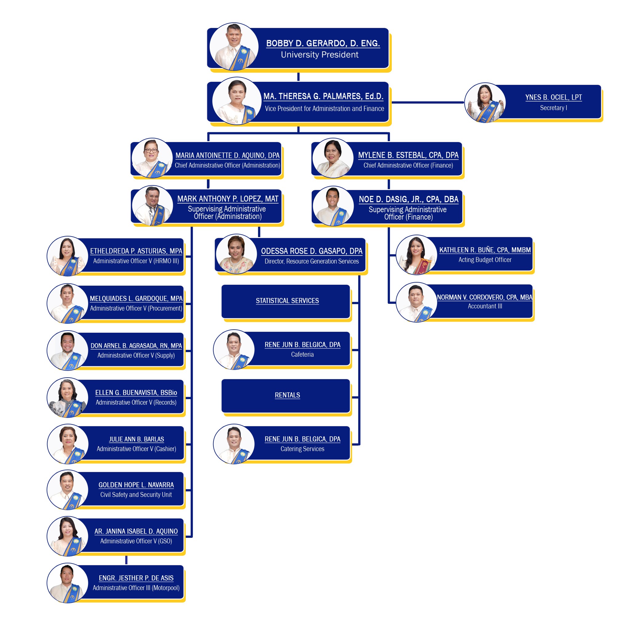| BULLOS, Delson D. Administrative Aide IV | ![]() DIAZ, Dannier C. Administrative Aide IV | ![]() GABASA, Genes M. Administrative Aide I | HIDALGO, Ryan Carl B. Administrative Aide IV | LACHICA, Jeymer B. Administrative Aide I | ![]() TOLENTINO, Ariel D. Administrative Aide I | ||